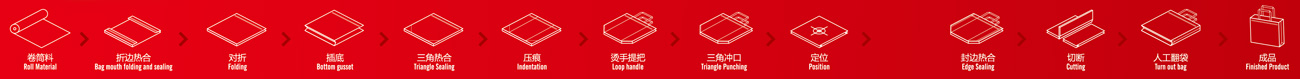 2、工序流程:卷筒料折邊一穿繩一熱合對(duì)折插邊定位---打孔 -一熱合切斷收集成品。